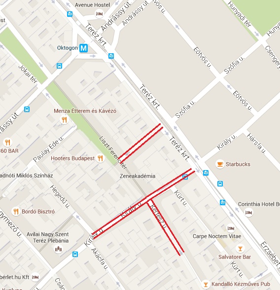 Király utca mindkét oldalán a Teréz körút és a Hegedű utca között,