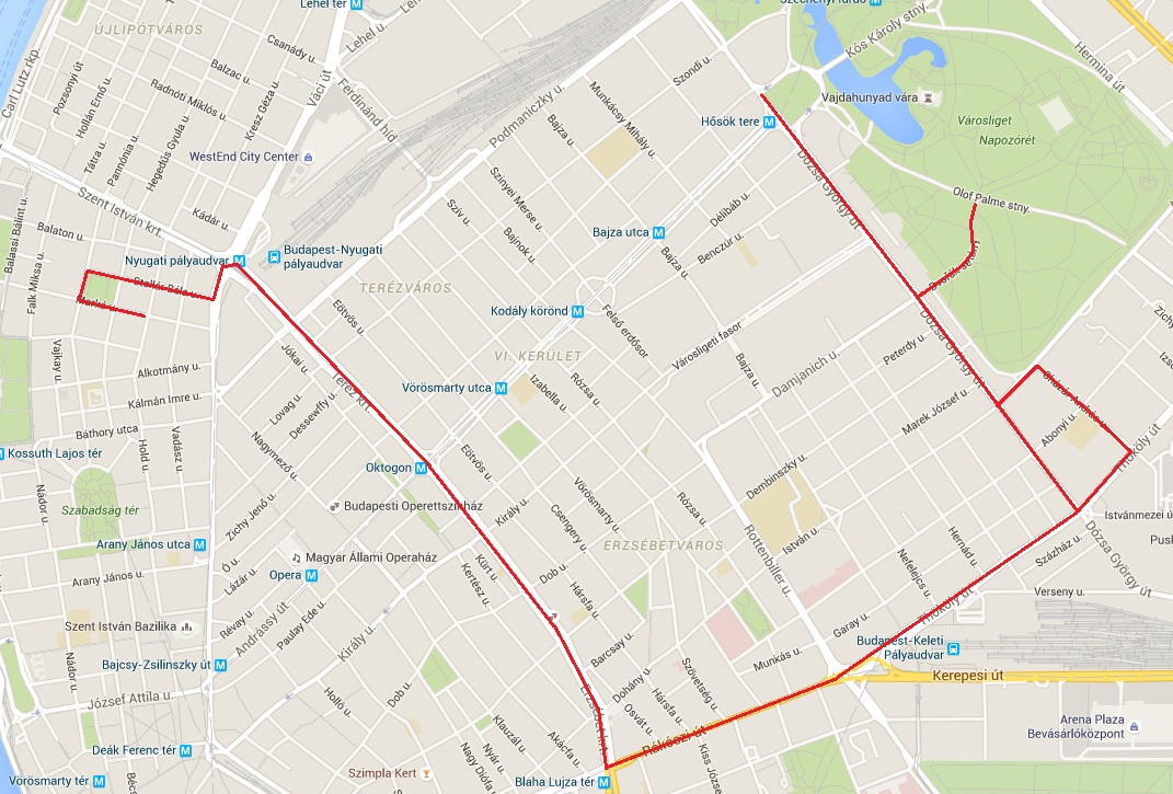 Dvorák sétány - Hősök tere - Dózsa György út - Thököly út - Czázár András utca - Ajtósi Dürer sor - Dózsa György út - Thököly út - Rákóczi út - Erzsébet körút - Oktogon - Teréz körút - Nyugati tér - Bajcsy-Zsilinszky út - Stollár Béla utca - Honvéd utca - Markó utca útvonal.