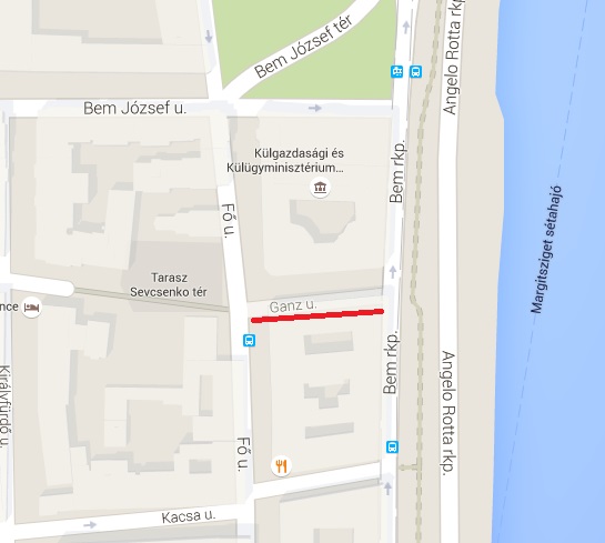 Ganz utca páros oldalán a Fő utca és a Bem felső rakpart között.