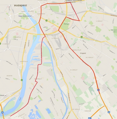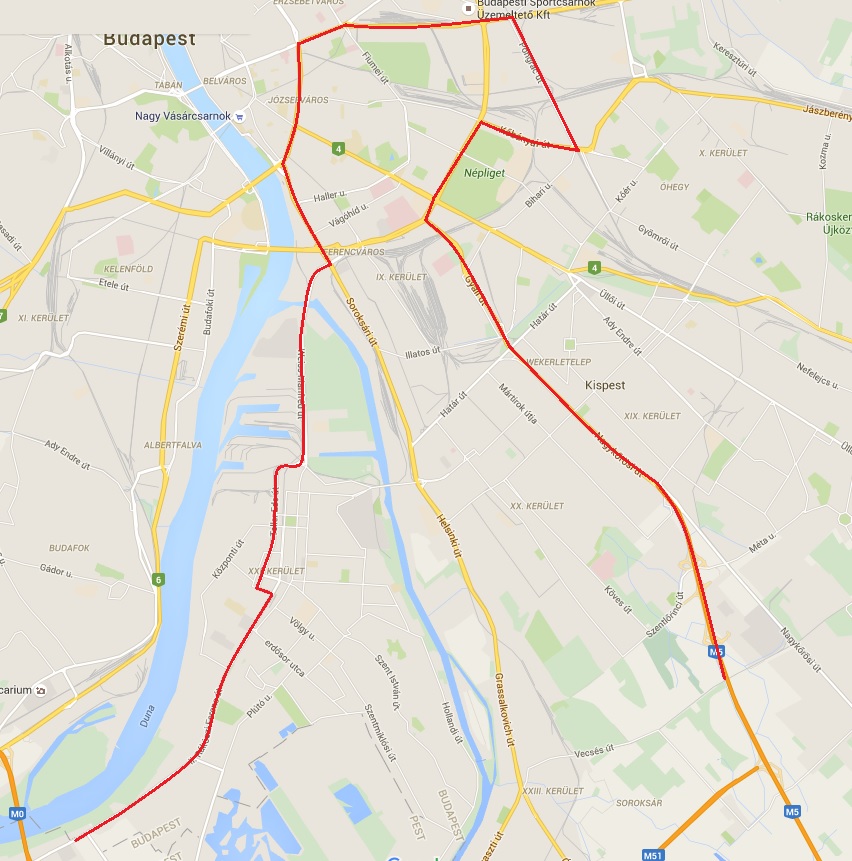 M5-ös autópálya bevezető szakaszán a Nagybani piac kollektor ága - M5-ös autópálya bevezető szakasza - Nagykőrösi út - Könyves Kámán körút - Kőbányai út – Pongrác út - Kerepesi út - Rákóczi út - József körút - Ferenc körút - Soroksári út - Kvassay Jenő út - Weiss Mannfréd út - Teller Ede utca - Posztógyár utca - II. Rákóczi Ferenc út - Budapest közigazgatási határa útvonalon.