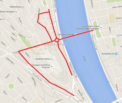 Váci út – Dráva utca – Pesti alsó rakpart – Széchenyi tér – Lánchíd – Clark Ádám tér – Fő utca – Ponty utca – Szalag utca – Hunyadi János út – Alagút – Alagút utca – Attila út – Apród utca – Ybl Miklós tér – Lánchíd utca útvonal.