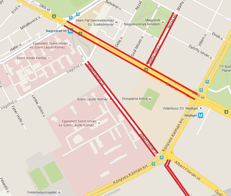 Groupama Aréna előtt lévő felüljáró (Nagyvárad tér felé eső oldal) mindkét oldali szervizútján és a felüljáró alatt.