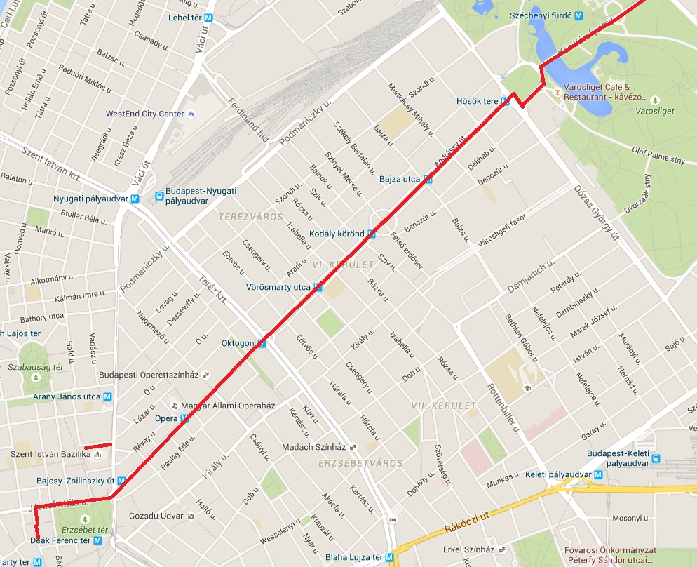 József nádor tér – József Attila utca – Andrássy út – Hősök tere – Kós Károly sétány útvonal menetirány szerinti forgalmi sávjai.