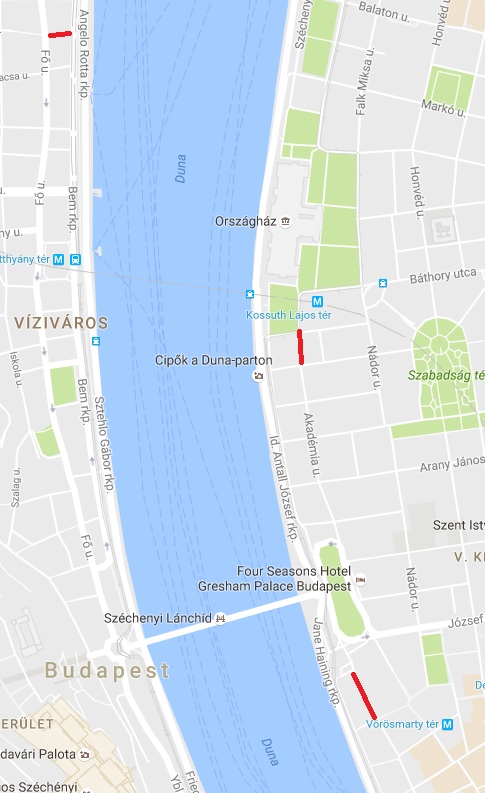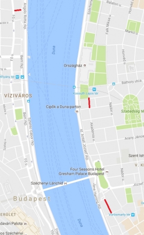 Apáczai Csere János utca 12-14. szám előtt a Hotel InterContinental mellett.