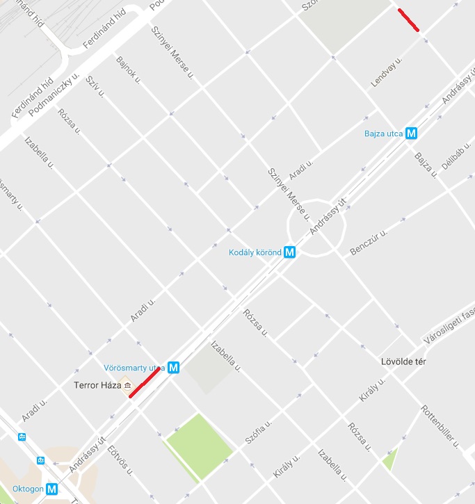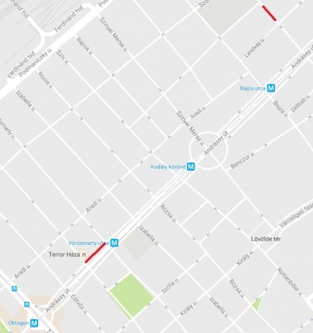 Andrássy út szervizútján a Vörösmarty utca és a Csengery utca között.