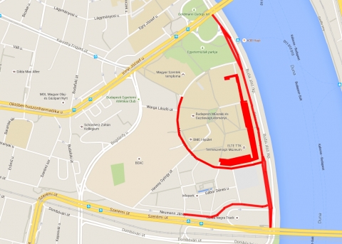 Pázmány Péter sétány mindkét oldalán a Rákóczi híd és a Petőfi híd között,