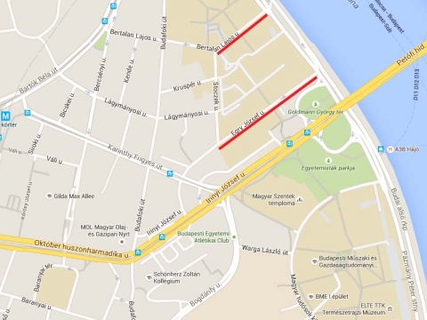Műegyetem rakpart mindkét oldalán a Petőfi híd és a Szent Gellért tér között,