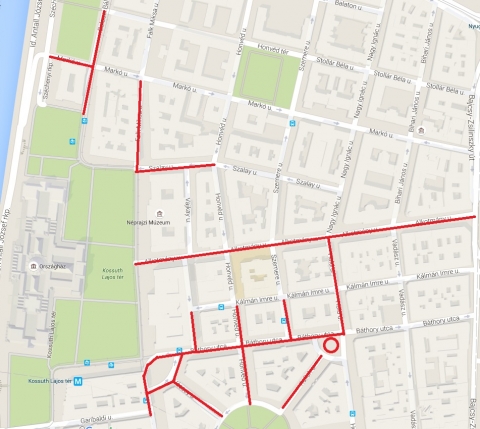 Báthory utca a Kossuth tér és a Kozma Ferenc utca között.