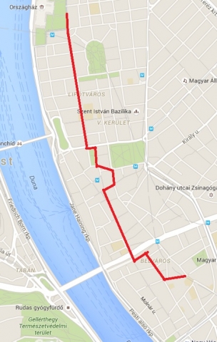 Egyetem tér – Papnövelde utca (úttest) – Nyáry Pál utca (úttest) – Váci utca (ahol széles járda lehetővé teszi járdán, úttest) - Deák Ferenc utca – Bécsi utca (járda) – József Nádor tér - Nádor utca (járda) – Kossuth Lajos tér Főtér bal oldala (Rákóczi szobor melletti terület) útvonal.