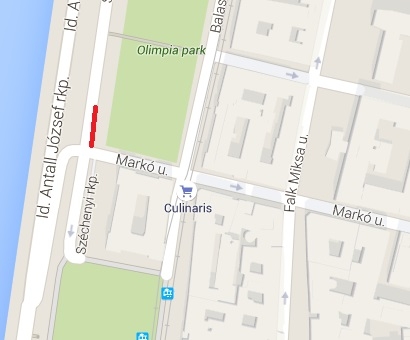Széchenyi felső rakparton a parkolóban a Markó utcától a Margit híd felé 20 méter hosszon.