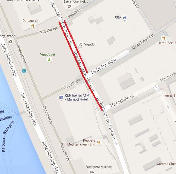 Apáczai Csere János utca mindkét oldalán a Vigadó utca és a Deák Ferenc utca között,
