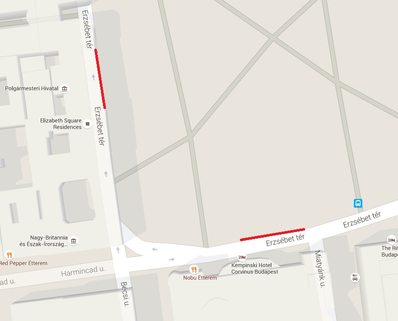 Erzsébet tér park felőli oldalán az V. kerületi Önkormányzat épületével szemben 25 méter hosszan.
