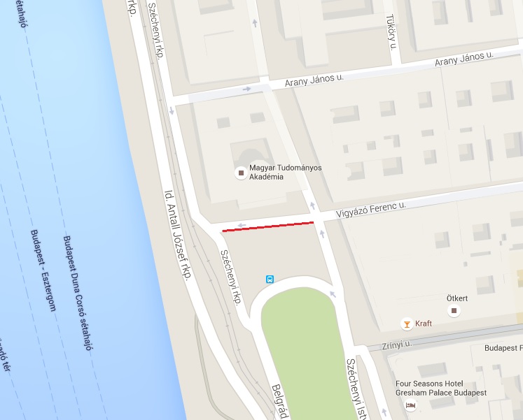 Széchenyi téren az MTA előtti szervizúton a parkoló felőli oldalon.
