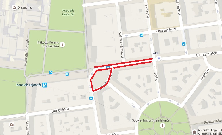 Báthory utca mindkét oldalán a Kossuth tér és a Honvéd utca között,