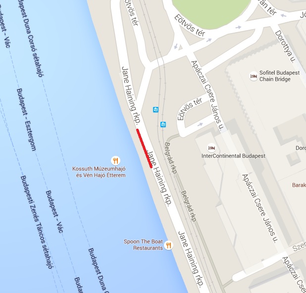 Pesti alsó rakparton (Eötvös tér vonalában) a Vén Hajó étterem előtt 30 máter hosszan.