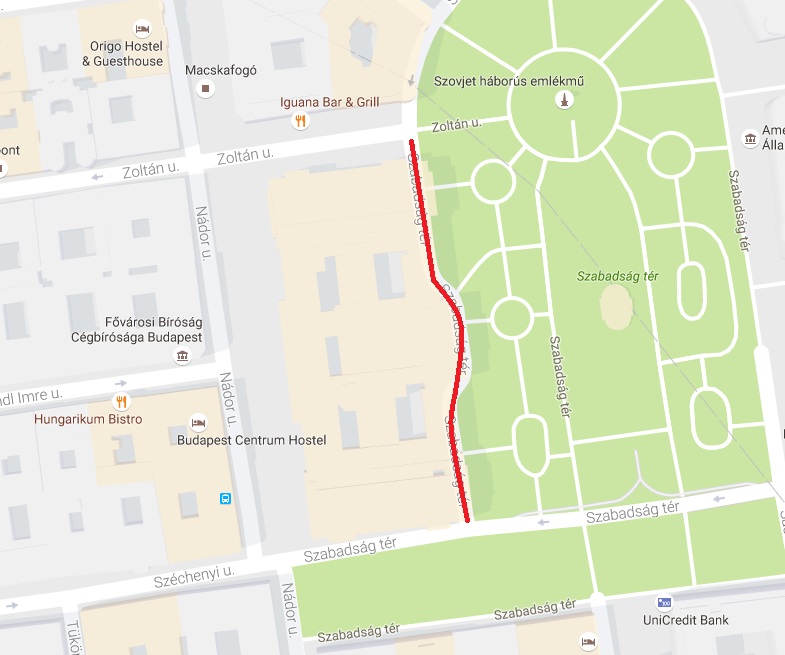 Szabadság tér Duna felőli szervizútján a Zoltán utca és a Széchenyi utca vonala között.