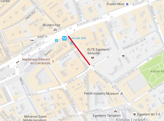 Ferenciek terén a Reáltanoda utca és a Kossuth Lajos utca közötti szakaszon.