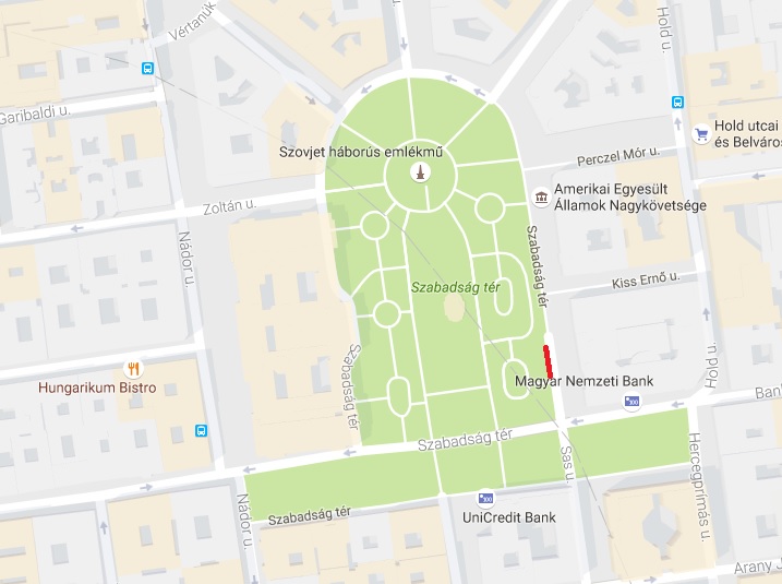 Szabadság tér 9. szám előtt a park felőli oldalon 10 méter hosszan.