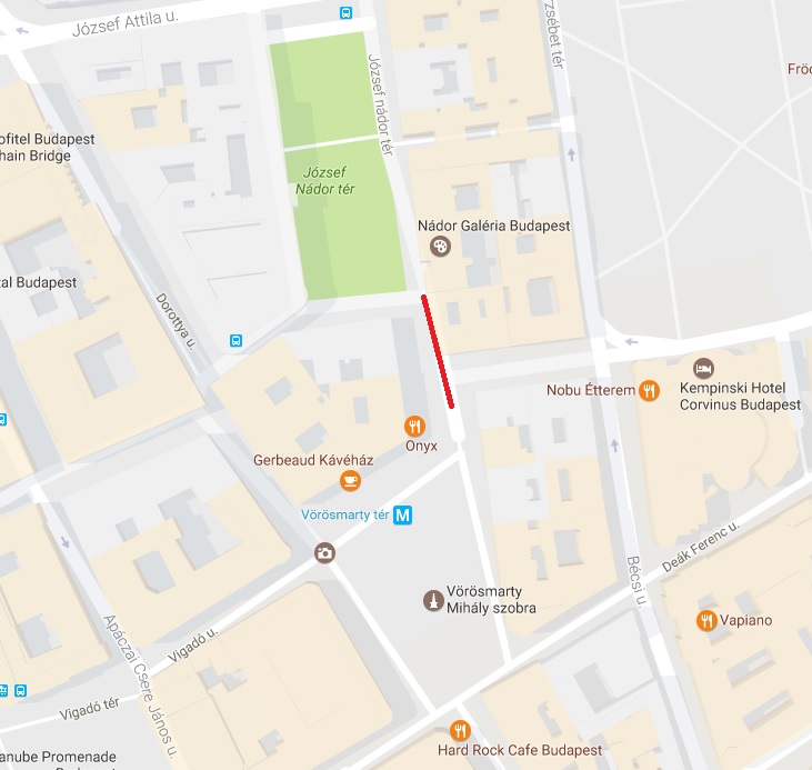 Vörösmarty téren a József nádor tértől (Harmincad utca) a parkolást gátló oszlopsorig.