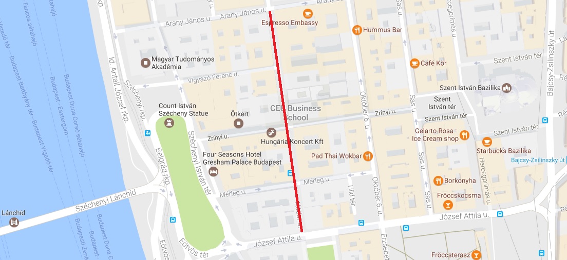 Nádor utca mindkét oldalán a József Attila utca és az Arany János utca között.