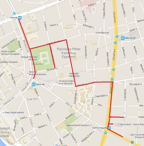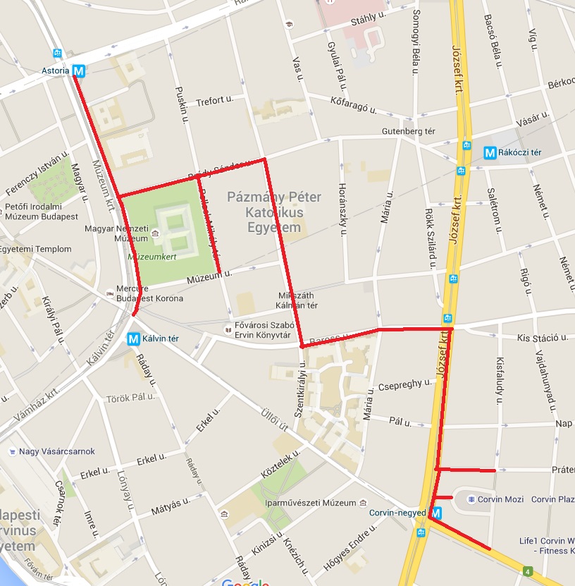 Corvin köz – József körút – Baross utca – Szentkirályi utca – Bródy Sándor utca útvonal.