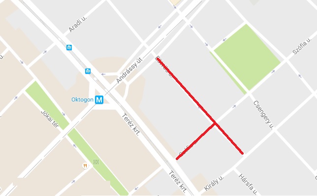 Eötvös utca mindkét oldalán az Andrássy út és a Király utca között,