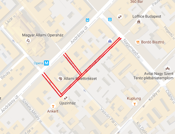 Paulay Ede utca mindkét oldalán a Dalszínház utca és a Nagymező utca között,