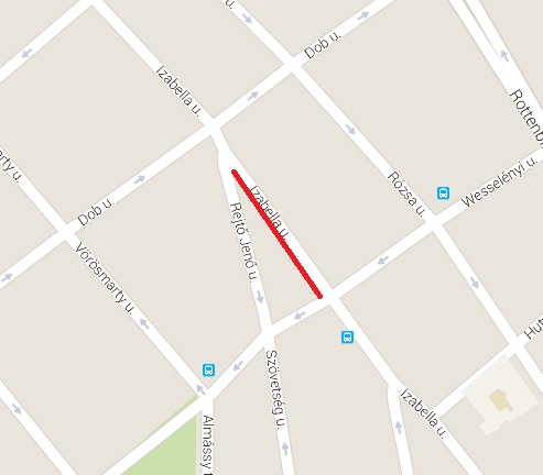Izabella utca Magyar Színház felőli oldalon a Hevesi Sándor tér és a Wesselényi utca között.