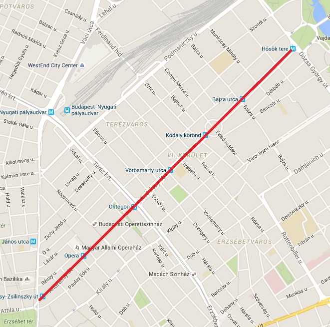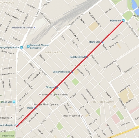 Andrássy út főpályája a Bajcsy-Zsilinszky út és a Hősök tere között.