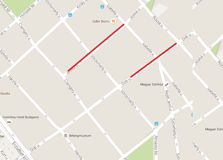 Dob utca az Izabella és a Csengery utca között valamint a Jósika utca 2. és 16. szám közötti szakasz.
