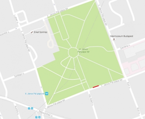 II. János Pál pápa tér 14. számmal szemben 10 méter hosszan.