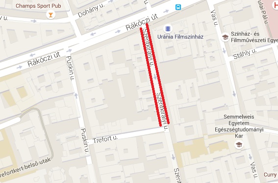 Szentkirályi utca mindkét oldalán a Rákóczi út és a Trefort utca között.