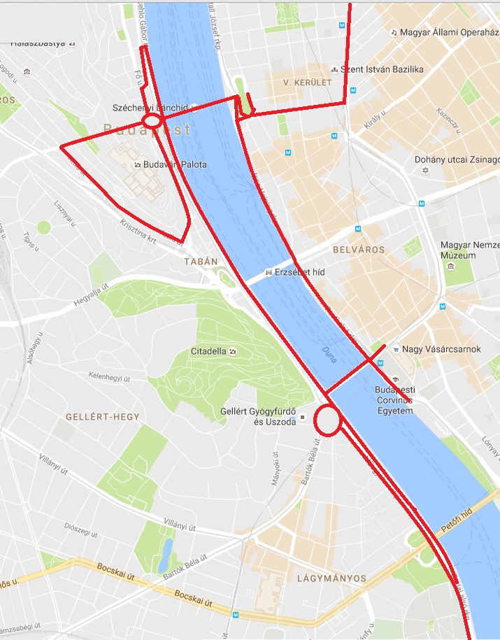 Clark Ádám tér - Lánchíd utca - Apród utca - Attila út - Alagút utca - Clark Ádám tér - Fő utca - Jégverem utca - Bem felső rakpart - Halász utcai lehajtó útvonal.