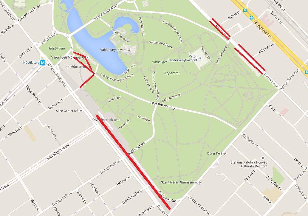 Műjégpálya előtti szervizúton az Olof Palme sétány és a Hősök tere között,