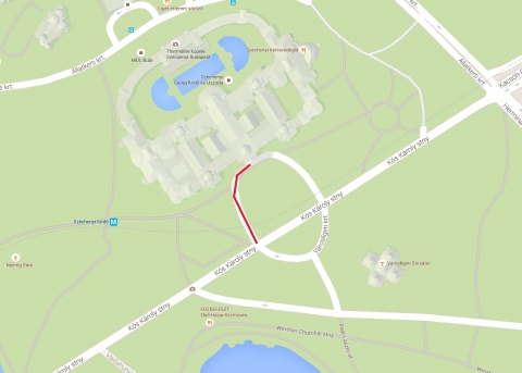 Széchenyi Gyógyfürdő „U” alakú szervizútján a hátsó bejárattól a Kós Károly sétányig a Hősök tere felőli oldalon.