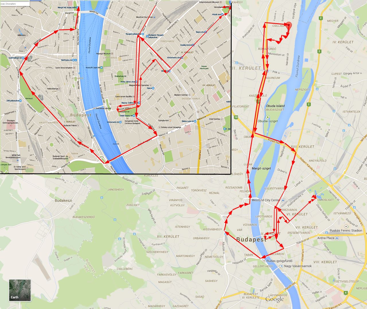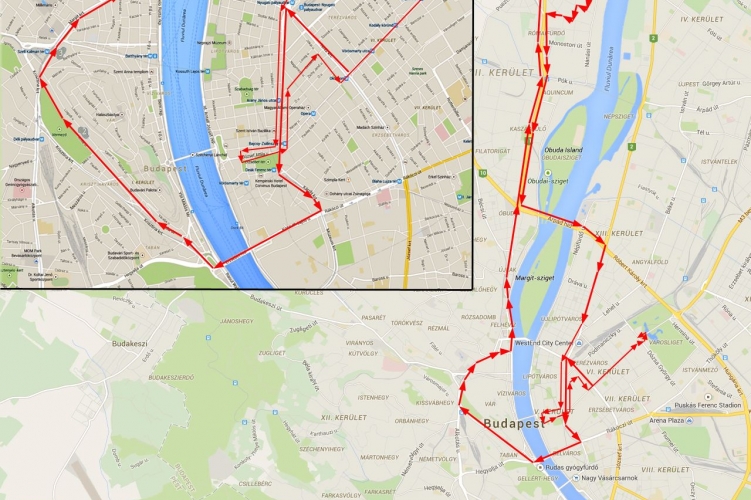 Oktogon - Nyugati tér - Bajcsy Zsilinszky út - Károly körút - Kossuth Lajos utca - Erzsébet híd - Attila út - Széll Kálmán tér - Margit körút - Bem rakpart - Lajos utca - Pacsirtamező út - Szentendrei út - Rákóczi út - Mátyás Király út - Berzsenyi Dániel utca - Pozsonyi út - Nagyvárad utca - Kalász utca - Cetz János köz - Szentendrei út - Árpád híd - Róbert Károly körút - Váci út - Bajcsy Zsilinszky út - József Attila utca - József Nádor tér - József Attila utca - Bajcsy Zsilinszky út - Teréz körút - Dessewffy utca - Jókai utca - Aradi utca - Teréz körút - Andrássy út - Hősök tere.