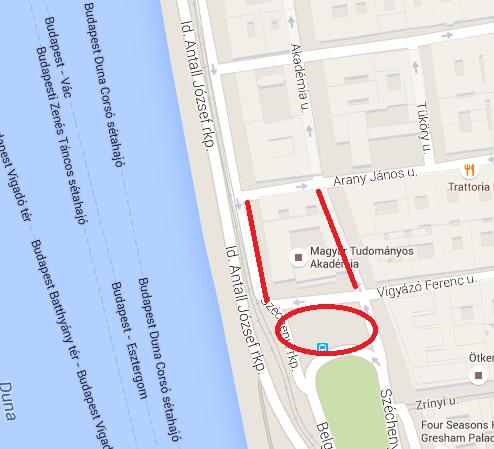 Akadémia utca MTA felőli oldalán a Vigyázó Ferenc utca és az Arany János utca között,