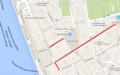 Apáczai Csere János utca mindkét oldalán az Eötvös tér és a Vigadó utca között.
