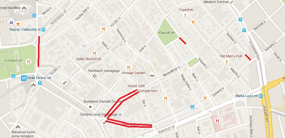 Kertész utca páros oldalán a Dohány utca előtt 40 méter hosszan,