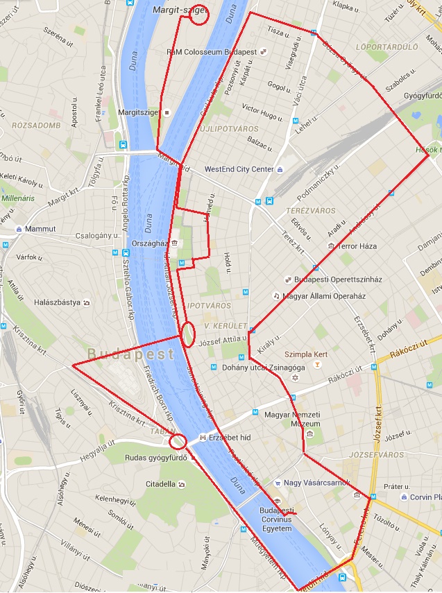 Közraktár utca - Pesti alsó rakpart - Dráva utca (menetirány szerinti oldal) - Dózsa György út (menetirány szerinti oldal) - Andrássy út (teljes szélesség) - Bajcsy-Zsilinszky út - Károly körút - Múzeum körút (menetirány szerinti oldal) - Üllői út (félpálya) - Ferenc körút - Petőfi híd - Műegyetem rakpart - Budai alsó rakpart - Döbrentei tér - Attila út - Alagút - Lánchíd - Széchenyi tér - Akadémia utca - Garibaldi utca - Nádor utca - Báthory utca - Honvéd utca - Markó utca - Széchenyi felső rakpart - Jászai Mari tér - Margit híd (Buda felé forgalom a villamossínen) - Margitsziget (Központi út teljes szélesség) - Margitsziget, Rózsakert alatti rét útvonal és az útvonal által határolt terület.