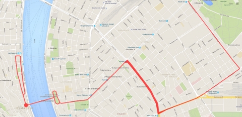 Hősök tere – Dózsa György út – Thököly út – Rákóczi út – Erzsébet körút – Teréz körút – Oktogon – Andrássy út – József Attila utca – Széchenyi tér – Lánchíd – Clark Ádám tér – Fő utca – Budai felső rakpart – Batthyány tér – Fő utca – Clark Ádám tér – Lánchíd – Széchenyi tér útvonal.