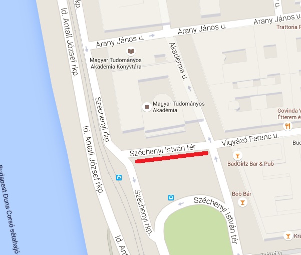 Széchenyi téren az MTA előtti parkolóban a szervizúttal párhuzamos részen.
