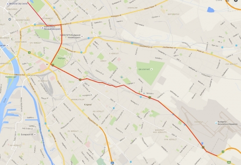 Hősök tere – Dózsa György út – Kerepesi út – Hungária körút – Könyves Kálmán körút – Üllői út – Liszt Ferenc Repülőtér felé vezető gyorsforgalmi út – 4-es számú főútvonal.
