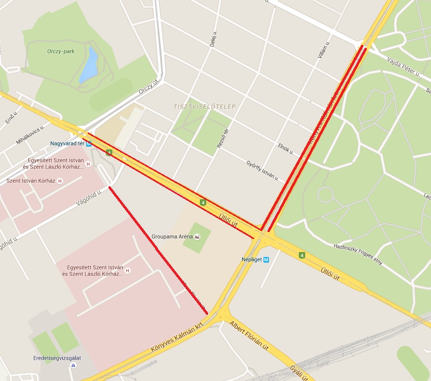 Üllői út Könyves Kálmán körút csomópontban lévő felüljáró melletti szerviz út mindkét oldalon a Könyves Kálmán körút és a Nagyvárad tér között,