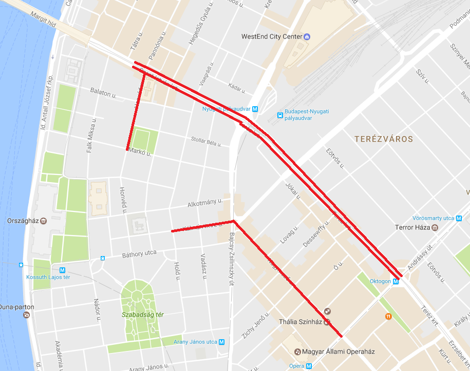Teréz körút mindkét oldalán az Oktogon és a Nyugati tér között,