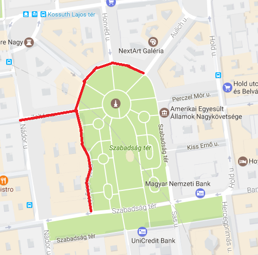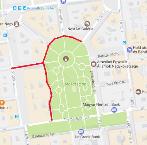 Zoltán utca mindkét oldalán a Szabadság tér és a Nádor utca között.