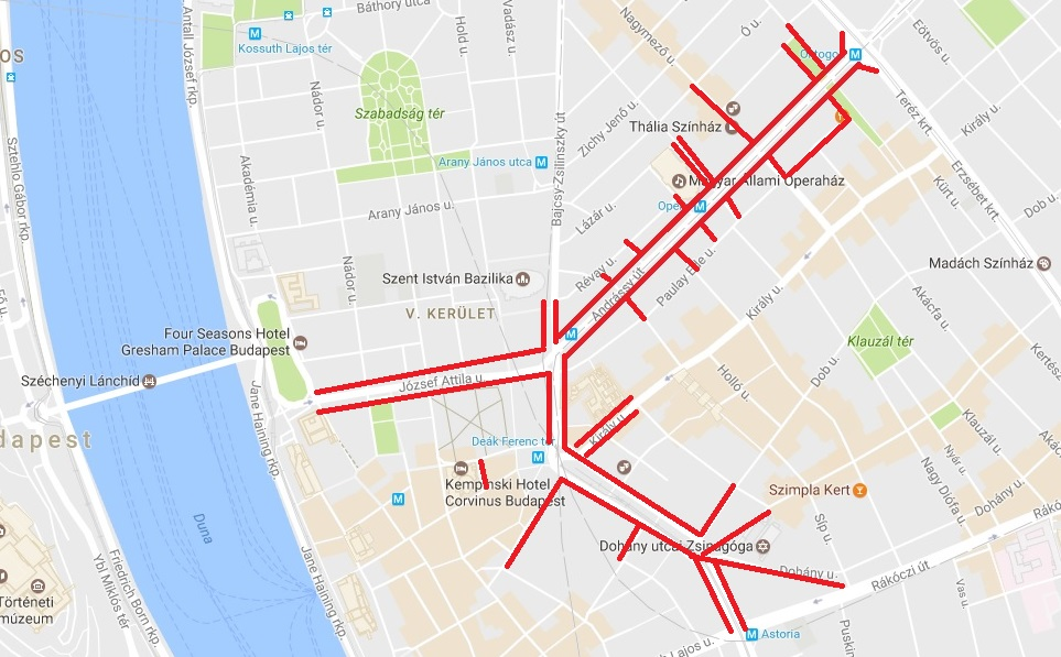 Bajcsy-Zsilinszky út mindkét oldalán az Andrássy út és a Deák tér között valamint a