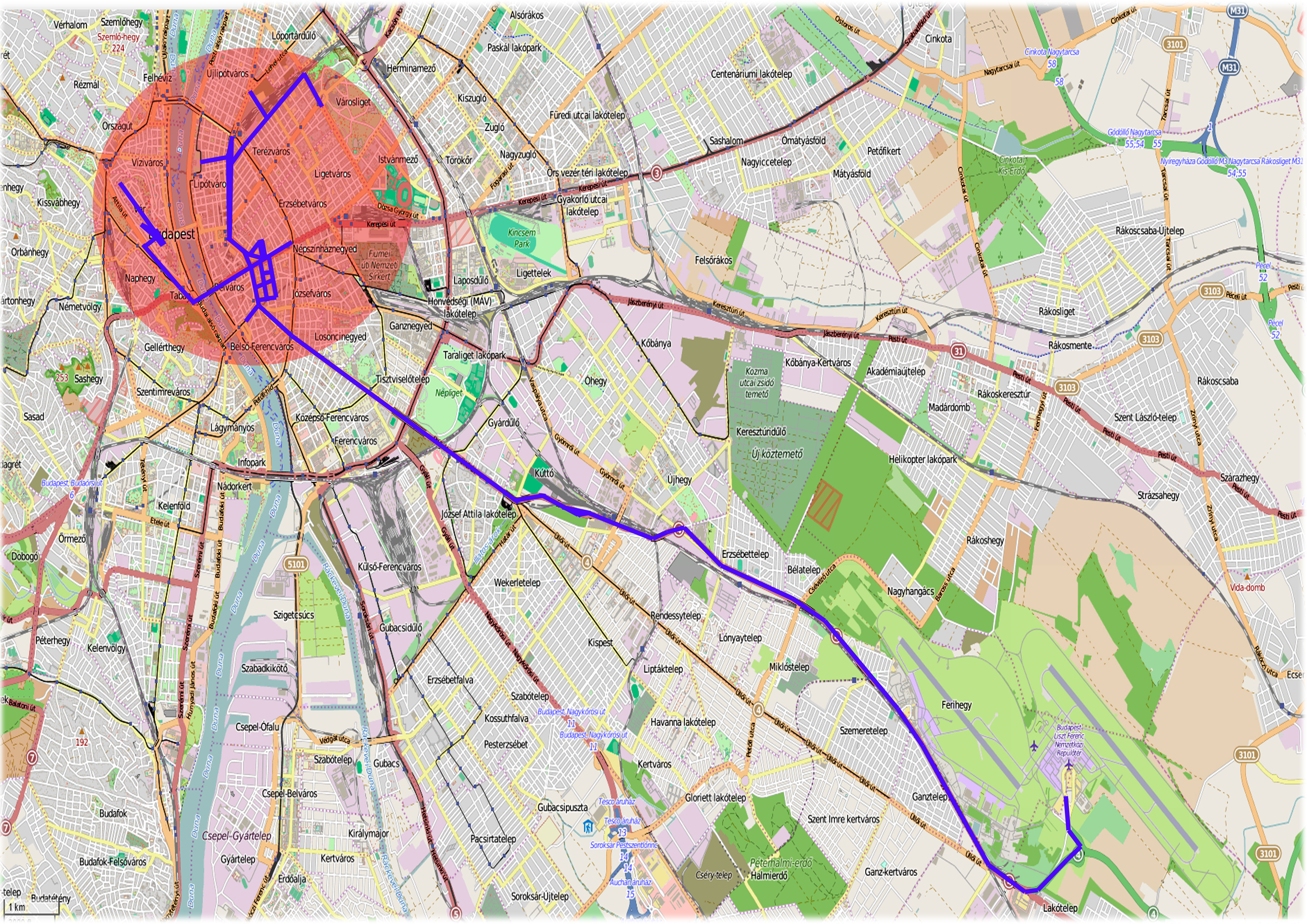 Károly körút – Múzeum körút – Üllői út – Gyorsforgalmi út - Ferihegyi repülőtérre vezető út - Budapest Liszt Ferenc Nemzetközi Repülőtér 2 útvonal.