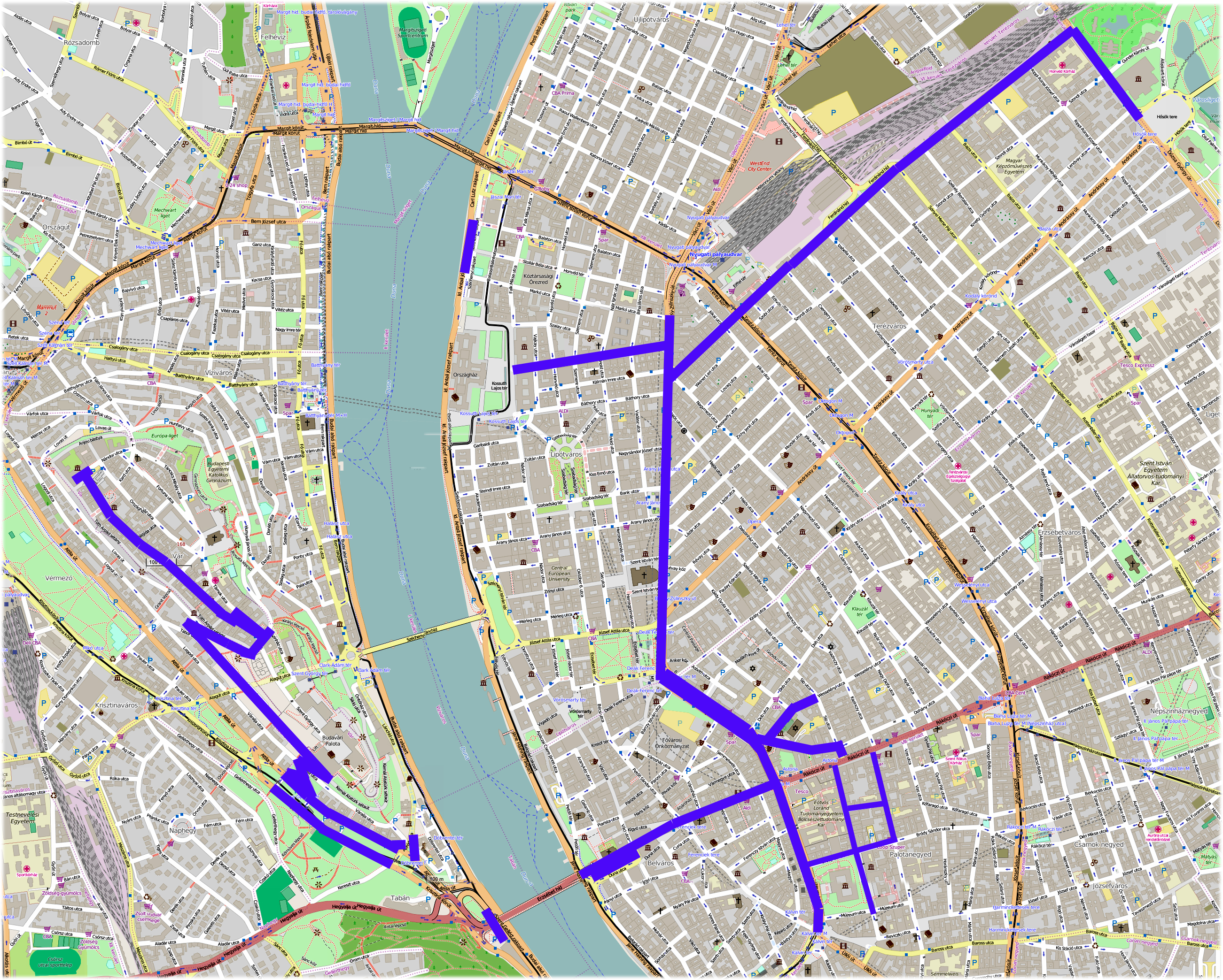 Alkotmány utca – Bajcsy-Zsilinszky út teljes szakaszon - Károly körút – Rákóczi út (Blaha Lujza tér és Astoria között) – Kossuth Lajos utca - Szabadsajtó utca – Erzsébet híd – Attila út – Palota út – Dísz tér – Úri utca útvonal,
