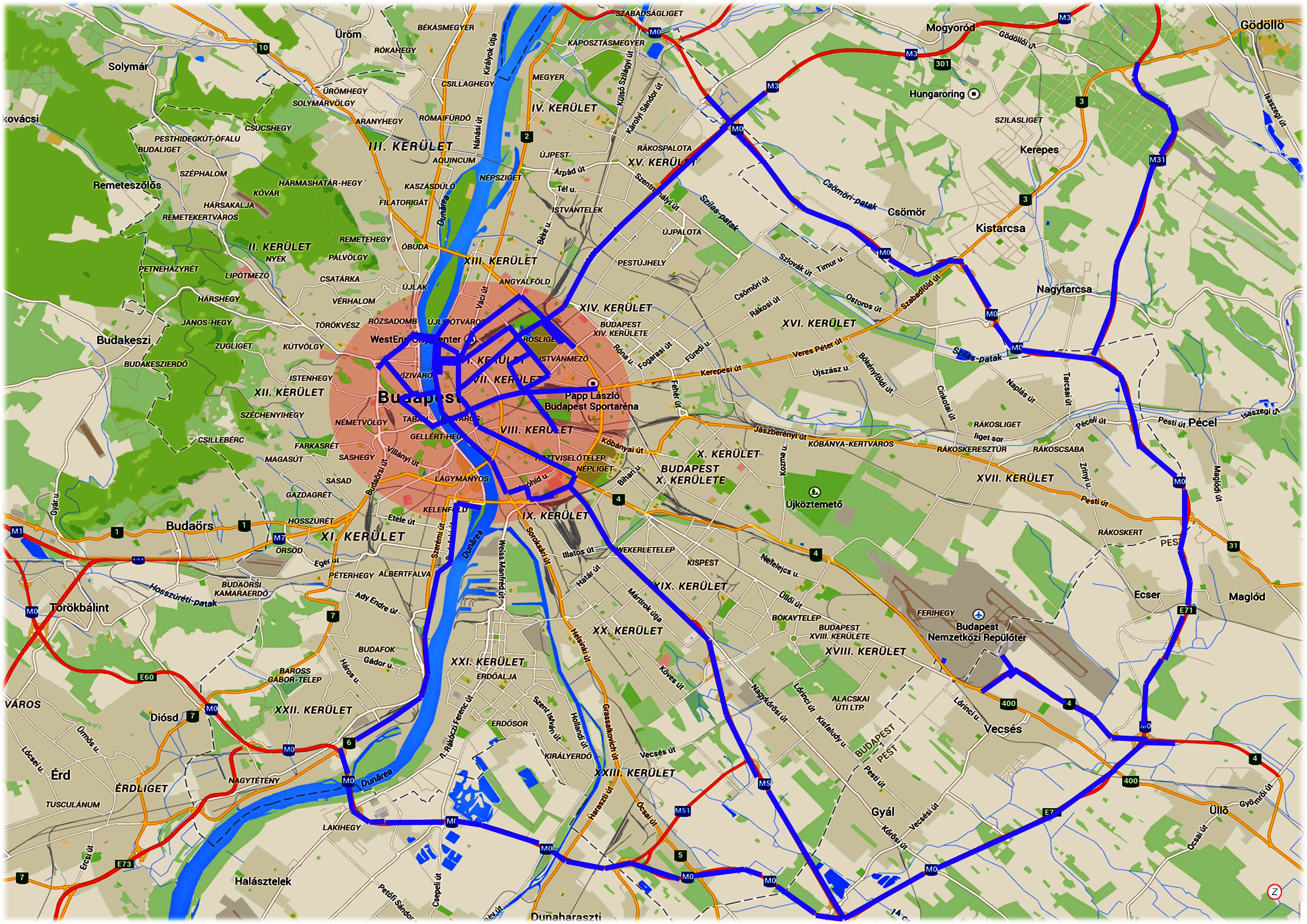 Budapest Liszt Ferenc nemzetközi repülőtér 2 terminál „E” porta - 4-es számú főút - M0 autóút - M3 bevezető - Kacsóh Pongrác úti felüljáró - Kós Károly sétány - Hősök tere útvonal,